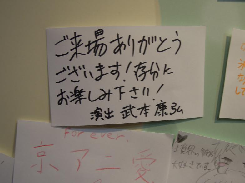 山田 今日は京都アニメーションを代表する方々ばかりで・・・発言内容に問題なかったですよね?(笑) 本当に遠いところからもお越しいただきまして、京都じゃない方というのは・・・?あ、結構いらっしゃいますね。ホテル取れました?この時期の秋の京都を楽しんでいって下さい。ありがとうございました。
