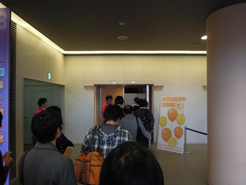 10:30になって案内係の指示に従いサイン会場へと列移動を開始。場所はステージイベント会場と展示会場のちょうど間くらいの小規模なスペースです。列の並びの順にパイプ椅子に着座すると1列10名が全部で5列。やはり計50名という狭き門でした。後で分かったのですが、TwitterのTLでよくお見かけする方がちらほらいらっしゃったのは恐るべき高確率というか皆さん運を持っていらっしゃるというか。