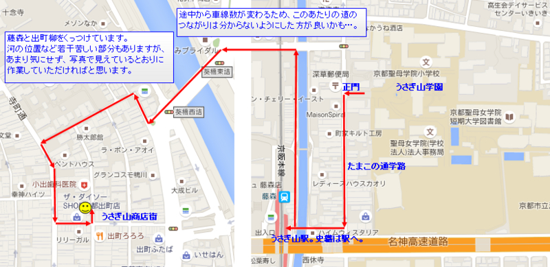美術設定の詳細を紹介したライブラリーゾーンでは、舞台探訪・聖地巡礼クラスタの間では長らく謎とされていた『たまこまーけっと』『たまこラブストーリー』の学校と商店街の位置関係を記した設定資料が公開されていました。記載されている内容はTVシリーズと映画を丹念に観ている者には自明のものなので、内容自体に特に驚きはありませんが、ここまであっけらかんと舞台設定の内部資料をオープンにしているということに軽い衝撃を受けました。その他の貴重な設定資料(「星とピエロ」のマスター愛用のレコードプレイヤーのモデルなど*8)も大量に公開されており、2年前のイベント時とはかなり趣きの異なった空気を感じました。以下、その設定資料を元に私が作った「うさぎ山学園全体図*9」と「たまこの通学路」のマップを掲載しておきます。マップ内のコメントは展示されていた資料に付記された文章のままです。