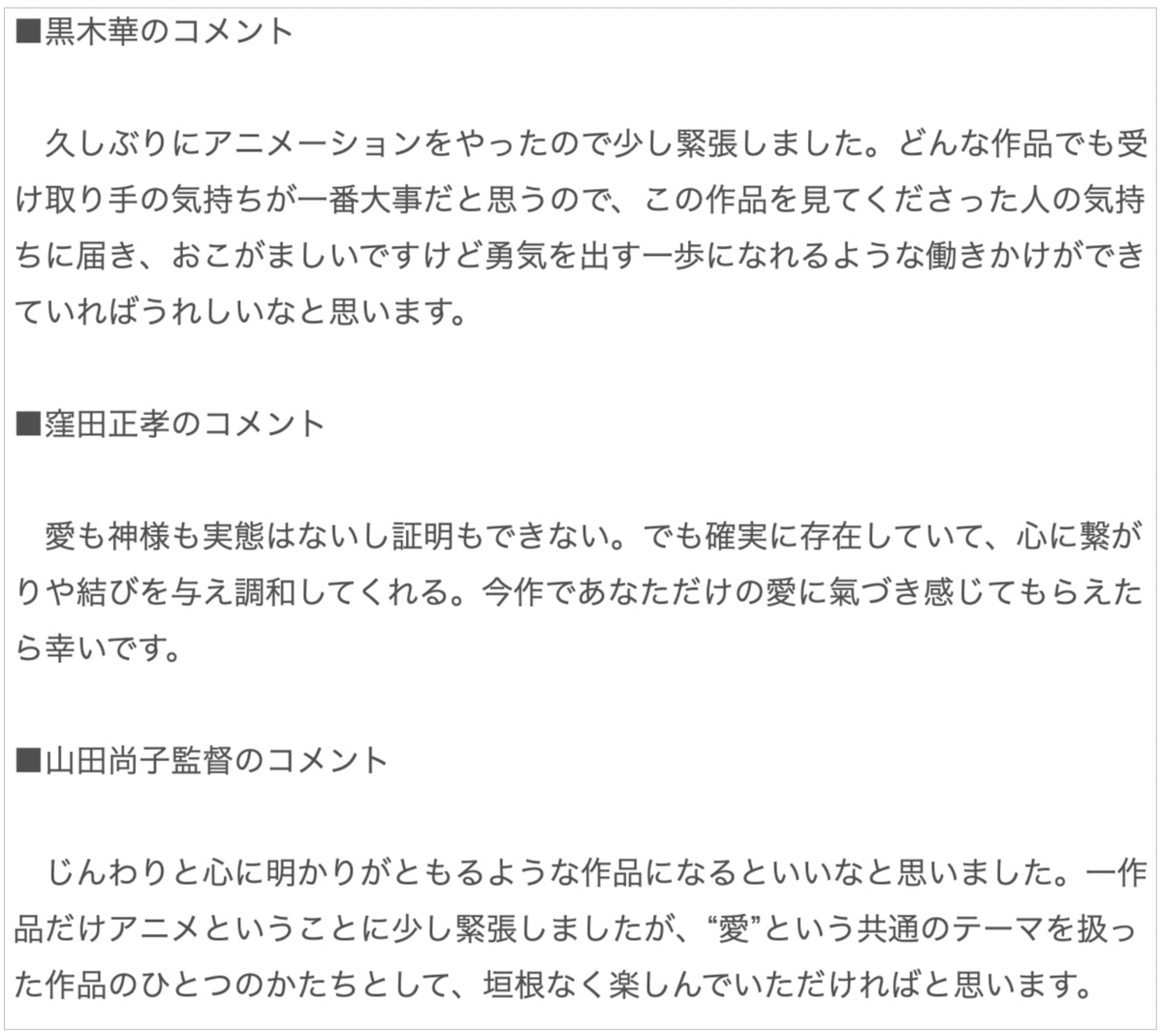 特に『彼と奏でるふたりの調べ』は唐突に制作が発表され、『Garden of Remembrance』は比較的近い時期か、あるいはほとんど同時並行で制作公開まで日が浅かったこともあり、当初は制作会社もスタッフもまったく情報がなかったが、脚本はいつもの吉田玲子さんではなく、荻上直子監督*1が務め、制作会社は山田監督がキットカットのCMを監督した時のアンサー・スタジオが手がけること、またメインキャストが俳優の黒木華、窪田正孝であることまでは分かってきた。しかし、その他のキャラクターデザイン、作画監督、音楽などのスタッフについては全く未知のままで公開当日を迎えることになった。